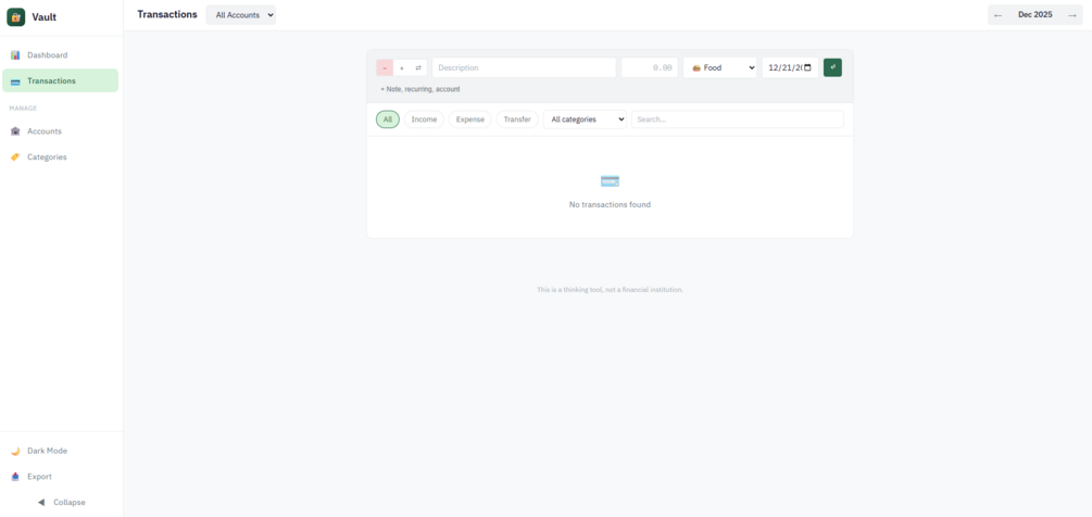 - Everything runs locally in your browser (localStorage). No cloud. No tracking. No “account required.” vault-finance-tracker