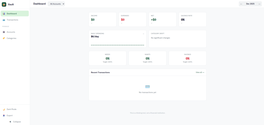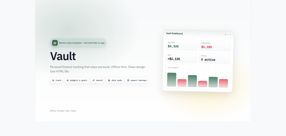 Vault is a personal finance tracker that lives in a single HTML file. No login. No app install. No subscription. Your data stays on your device.