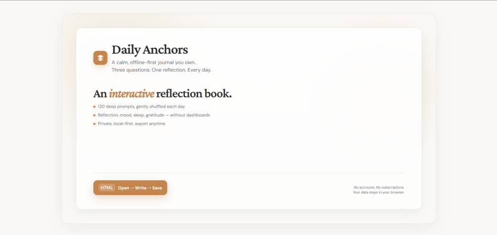 It’s an interactive reflection book: three prompts a day, a simple “Today” section, and just enough structure to help you think clearly without turning your life into a dashboard.