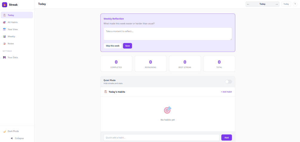 - Quiet Mode: hide streak pressure and keep the focus on showing up
