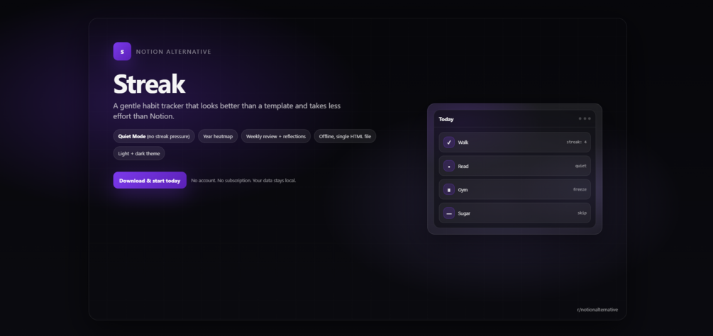 Streak is a single-file habit tracker designed for people who want consistency without the guilt-trip.