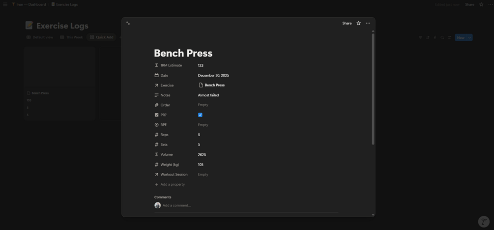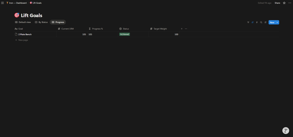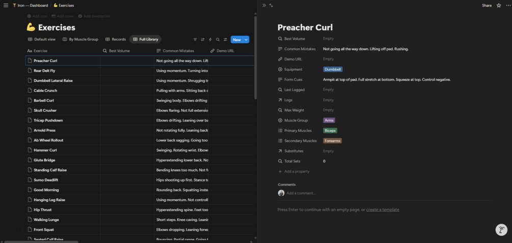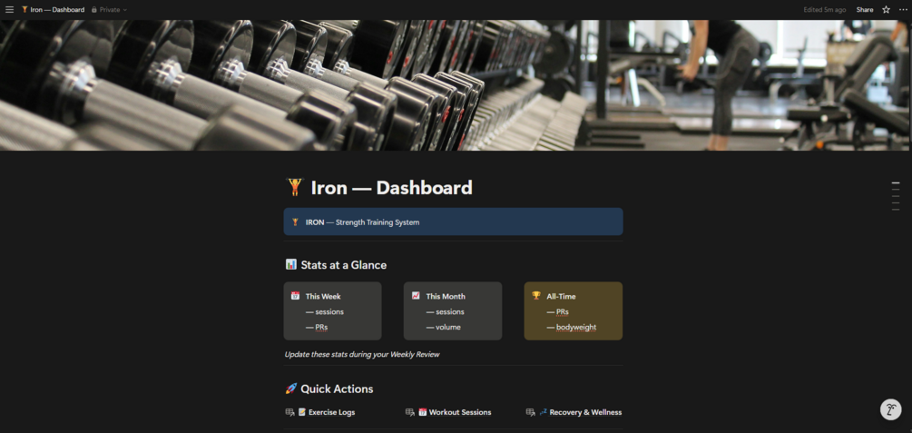 Iron is a complete strength training system built in Notion — designed for lifters who care about progressive overload, personal records, and long-term gains.