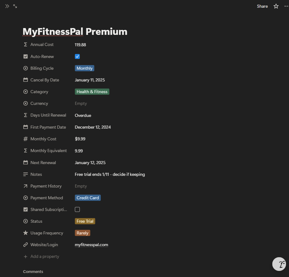 β Other trackers: No guidance on what to cancel β This template: Usage Frequency shows waste instantly