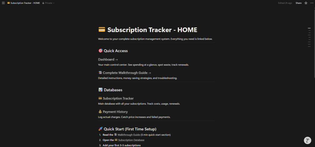 π Setup Guide PDF (7 sections, immediate download) π HOME page (navigation hub) π Dashboard (spending overview with callouts) π³ Subscription Tracker database (21 properties, smart formulas) π° Payment History database (linked relation tracking) π Complete Walkthrough Guide (10 sections, 6 money-saving strategies)