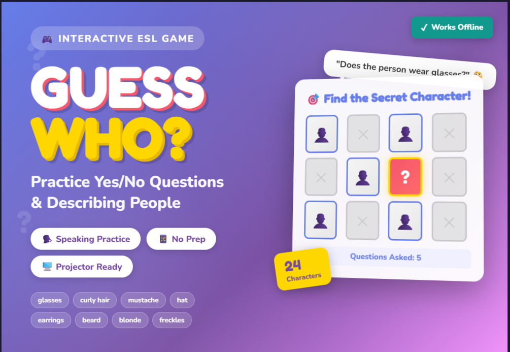 Get your students speaking with this interactive Guess Who? game! Perfect for practicing yes/no questions and physical description vocabulary. One HTML file with 24 unique character images. Works on any device. No internet needed.
